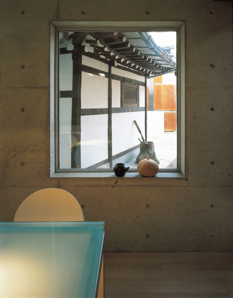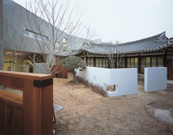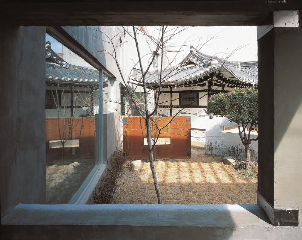 대지의 경계를 따라신축의 주거 매스를, 한옥을 둘러싸며, 길게 배치함으로서, 그 매스는외부와의 울타리가 되었고, 동시에 기존 한옥과의 사이에 외부공간을조성하게 되었으며, 이 외부공간들은 기능별, 지역별로 나뉘어 시간성을가진 “벽”으로 구성되는 “마당”들로 성격화되는“장소”가 되었다.
