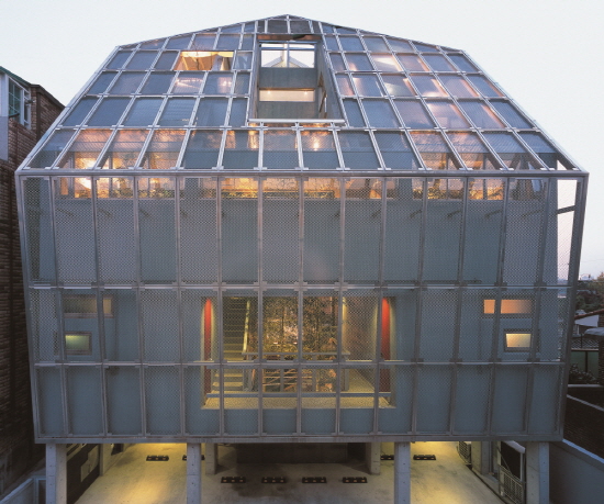 Indistinct landscape of the village, clearly visible shape of the Korean-style house, the whole views of Seoul with Namsan tower and the festive night views were the landscape program of Jo Rin Hun. The city and architecture are endowed with strong mutual response and finally this mass become to carry the un-architectural property of matter of transparence introversively, translucence extrorsely. It is intended to feel Jo Rin Hun, which is vertical and huge mass comparatively, as 'un-architectural' property of matter to harmonize with the horizontal stable landscape formed by the remaining Korean-style houses and to form a new city context that corresponds to the change. It lost by the shaded portion of road. right to enjoy sunshine. cultural property protection. By indoor planting to the remaining mass, It could be recognized as an ecological mass, as well as, the whole could recognized as if translucent/opaque un-architectural object are covered with expended metal and intended to grant a formable sensitivity that harmonized with the image of Korean style house to the structure of skin.