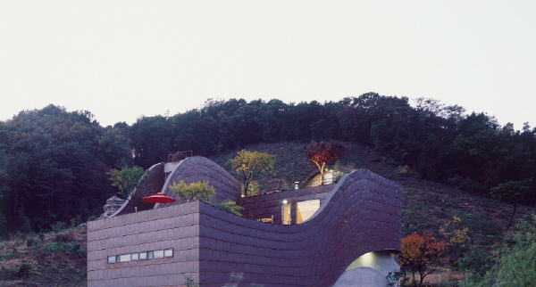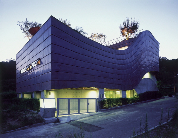 곡선형태의 대지 후면의 건축화와, 내부공간의 유동적구성, 그리고 주변자연의 맥락과의 형태적 조화를 의도하여 이 건축의 조형적 어휘는 결국 유동하는 곡면으로 구성된, 마치 자연을 건축화한 비건축적 조형을 만들어냈다.
