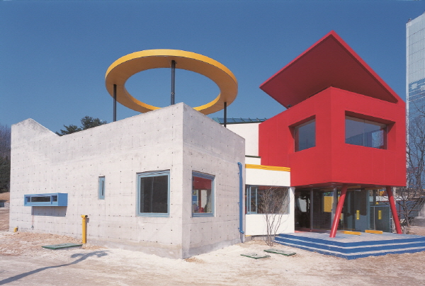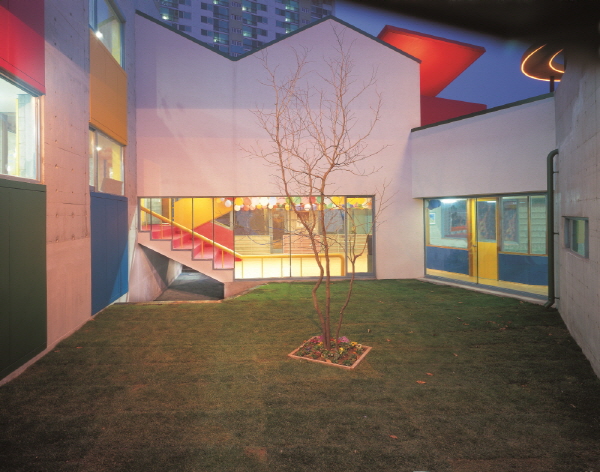 대지의 고저차는 반층 씩 연결된 레벨 계획을합리화시켜 주었으며, 이는 편안하고 재미있는어린이 수직 동선으로내부 공간의 변화를 연결한다. 조용한 공간으로 둘러싸인 좌측 안마당은보는 정원인 동시에 놀이장, 학습장으로 쓰이는 공간이다. 이는다목적 홀 하부의 작은 통로와 우측 마당으로 통하며 또다시 수영장과놀이 기구가 있는 오픈 공간인 놀이마당으로 통하도록 해 외부 공간의순환을 계획했다. 1층 옥상의 야외 교실은 간이 수영장과 함께건물의 외벽들로 둘러싸여 또 다른 성격의 외부 공간이 되고 있다. 공사비 절감을 위해 노출콘크리트를 주재료로 사용한 것은 이것들의거침이 주제를 위한 바탕으로서 오히려 주제를 강화시켜줄 것이라는확신에서였다.