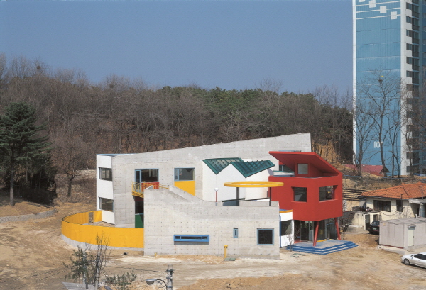 산을배경으로 한 도심주거지역의 풍경이 미래의 주변 맥락일 것이다. 이미 이 지역에서 큰 규모의 어린이 학원을 운영해오고 있었던 건축주는체험적으로 다수인이 집회 할 수 있는 커다란 공간과 적극적인 야외학습공간을 요구했다.