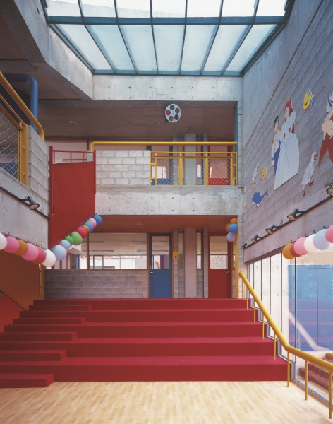 The difference of elevation rationalized the level planning which is linked to every half floor. It causes children's comfortable and interesting vertical circulation and connects the change of inside space. The courtyard on the left which is surrounded with quiet space functions as a playground, a learning place and a seeing garden. It leads to the garden on the right and small passage of the lower part of multipurpose hall and leads to the open playground with a swimming pool and ride continuously to circulate outside space.
