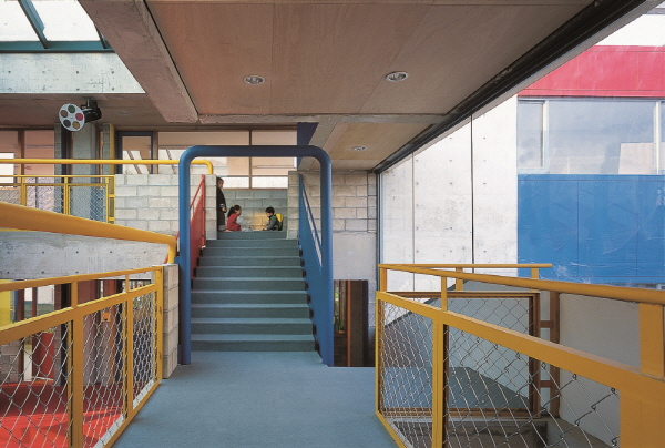 The inside court is divided by transparent glass, so the inside and outside space is combined each other. It creates a form of natural assembly and children's parents could overlook the stage on the first floor from the stand on the first floor-staircase the passage, corridor, stairway of second floor, mid-second floor, mid-third floor when an event is open.