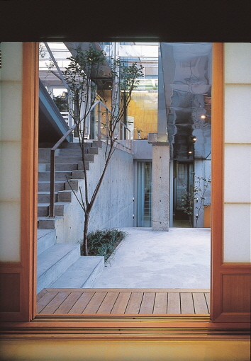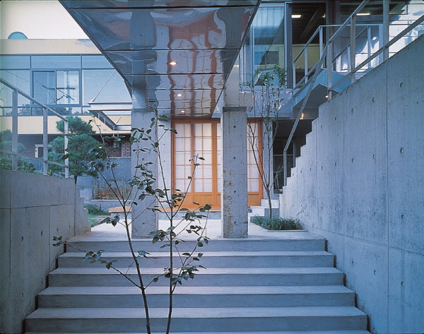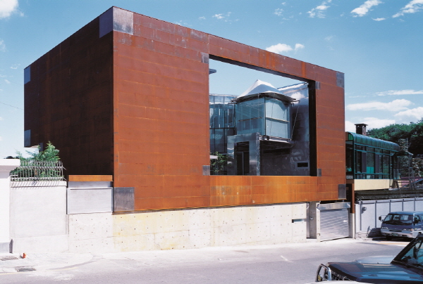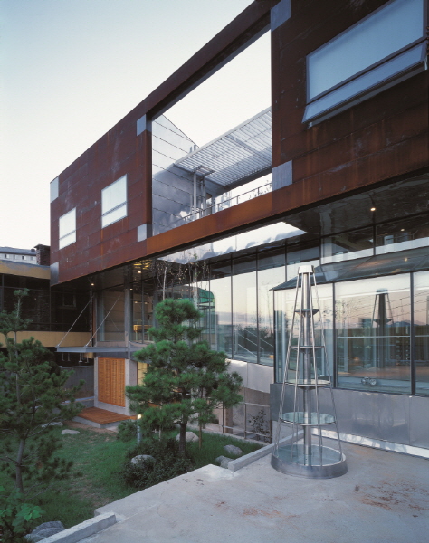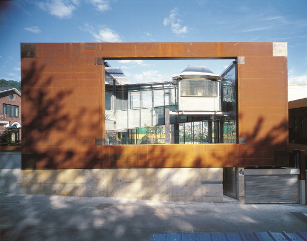 이 녹슬은 MASS의 내부는 의도된 삶의 형식에 따라 여러 “마당”의 공간이뚫리게 되어 새롭고 풍요로운 삶의 이야기가 피어나기 시작할 것이며, 이 뚫린 주변의 내부 표면이 될 속살은 현대적 표현인 스텐레스로구성되면서, 이것은 이제부터의 새로운 삶의 역사를 의미하게 되어, 외곽 도로측과 인접대지변은 내후성 강판으로, 내부 마당측변 벽면은스텐레스로 구별되면서, 두 재료를 통해 시간의 차이를 표현하고자했으며 결국, 내외부가 전체적으로 메타릭한 분위기를 구사하게되었다.