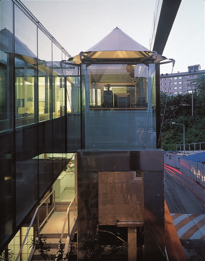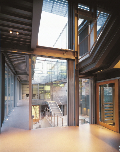 둘째는 공사비의 절감이었으며, 이 방안으로서 기본적으로철골의 골조를 그대로 노출시켜, 구조재가 동시에 마감재가 되는방식을 취하여 경제성을 획득하려 했다.