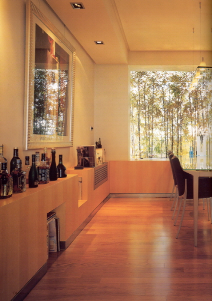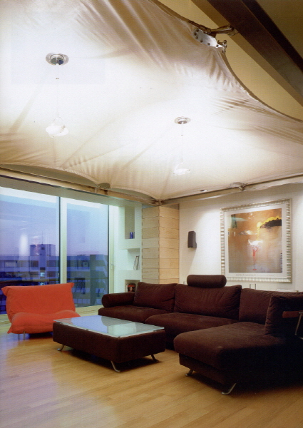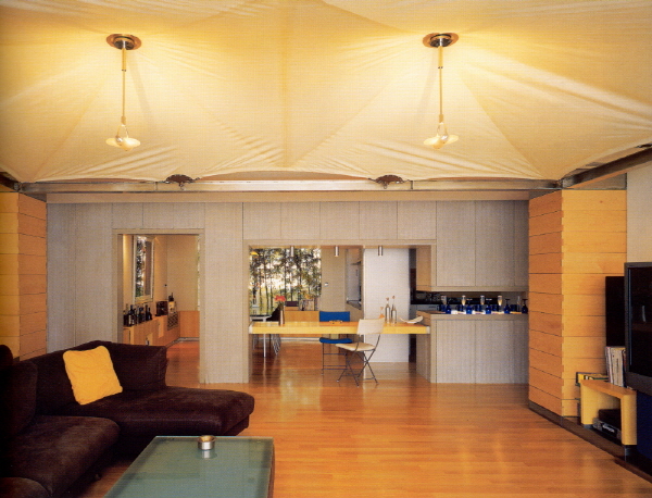 식당옆 기존 베란다를 “대나무화단”으로 변환시킴은 “흙”과 접촉하려는본능적 안간힘이며, 거실 천장의 “천막”은 그 위가 “하늘”일 것이라는착각의 “희망”임이다.