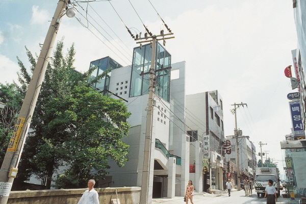 Finally, the commercial capacity is satisfied with the accomplishment of the maximum architectural area with the indefinite shape of site and similar shape of level. The transparent g|ass is used as an intention a factor to raise the commercial effect that has psychological absorption by applying the outside stair as a 'passage'. Later on, the architectural factors for these commercial raise are more developed and applied in the architectural design of 'Si|ver Boat(Namkang building)’
