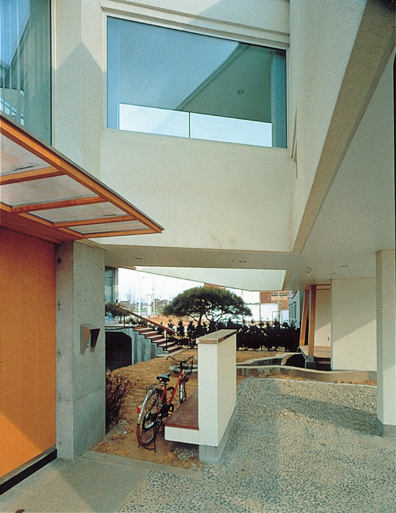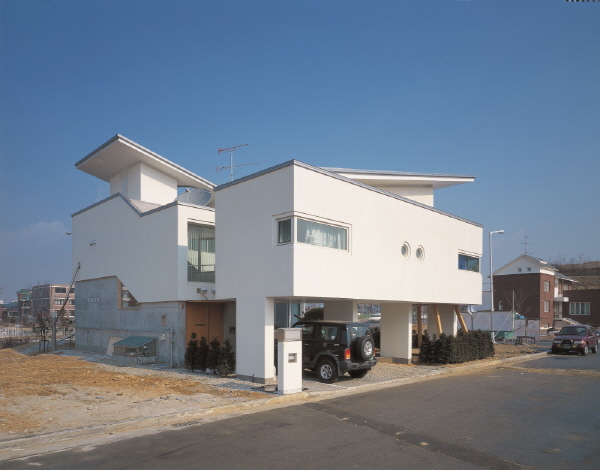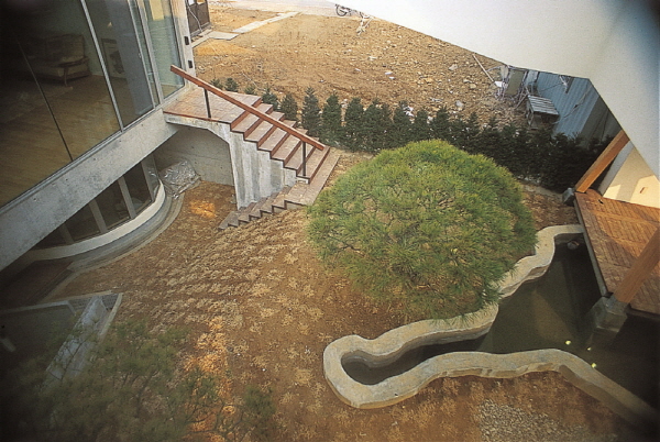 he house located site is the foot of Mt.Jeongbal. The site is adjacent to public green tract area 40m-roadside. There are various shapes of house including American-style wooden house. It is an exclusive residential area under developing where people could grasp the Korean public culture of architecture at the end of 1990's. It was an intended aim of the design to form a 'garden' where have a various character by leasing most of the site and to present 'spatial drama' which would create various/abundant stories and pictures with the conversation and connection of garden which is an outside space. It was the work to do to find the program to satisfy mentioned aims.