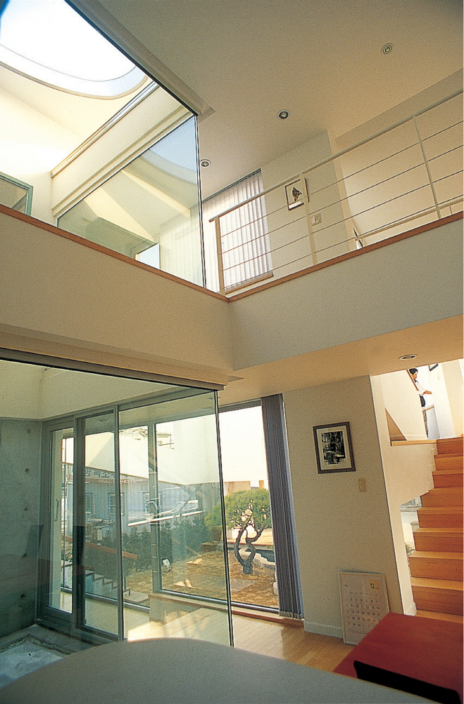 I intended to connect every room with every garden in the house and this arrangement satisfies the seasonal weather condition because most of the rooms facing north-side. The program formed basic configuration and the condition of sloping roof, requested by the guide of urban designing of new town, set limit to the formative alternative plan. The image of 'wing', 'soaring', 'freezing of movement' may be a latent expression a preference of the essential stylishness of the roof of traditional architecture.