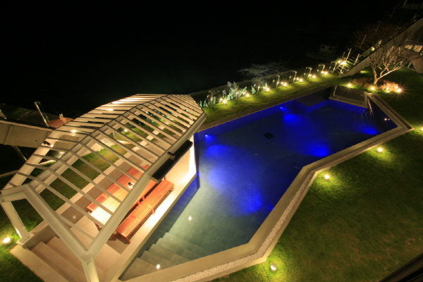 토지이용효율을 극대화하면서, 다각 부정형의 대지 형태를 따라 수영장이 있는 마당을 품어 안은 길다란 콘크리트 매스의 배치가 구성되어, 물과 녹지로 채워진 이 마당은 “건축화된 자연”이며, 강과 건축을 소통시키는 “연장된 강”으로서의 중심적 휴양공간이다.