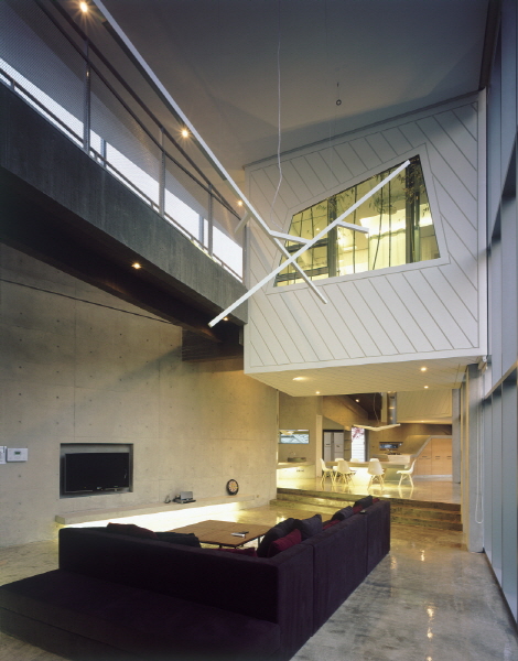 당연히, 이 대지 형태의 매스 속 모든 실들은 강으로 향해 회화적 산수의 풍경을 흠뿍 즐길 수 있도록 적극적인 풍경지향적 배치가 되어있으며, 상부 계단식 옥상정원의 바닥레벨들이 만들어내는 실내 경사천정선과 안마당의 바닥선으로 구성되는 거실의 거대한 전면창의 후레임을 통해 회화화된 파노라믹한 전면의 산수풍경은 이 집의 대표적 인상이 되고 있다.