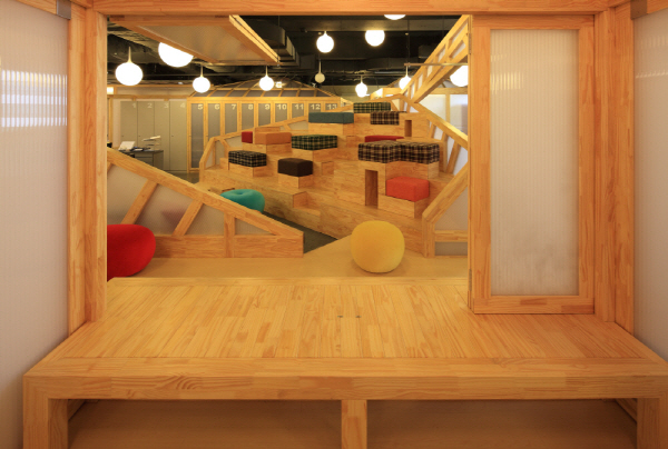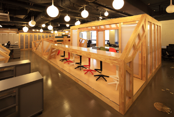 Young people, the user of this space, require to use wood for main material because of it’s ecological property. We decided to use translucent polycarbo-nate glass as a sort of partition. thereby, we try to produce a traditional but modern office landscape by contradistin-ctive harmony of wood and plastic glass, in terms of material.