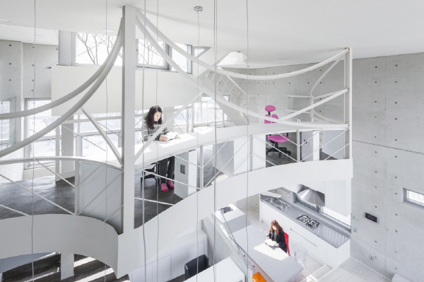 Dynamic stairways are flying from 1st floor at front road up to roof garden at the top of 6th floor, strolling on various routes of this vertical town.