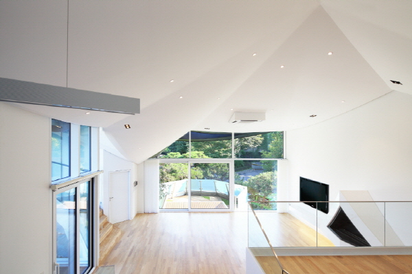 By introducing “Ru” which is Korean-pilotied architecture, we absorbed the dynamic and picturesque landscape of near mountain, according to turn the axis of mass of living room to top of the surrounding mountain.