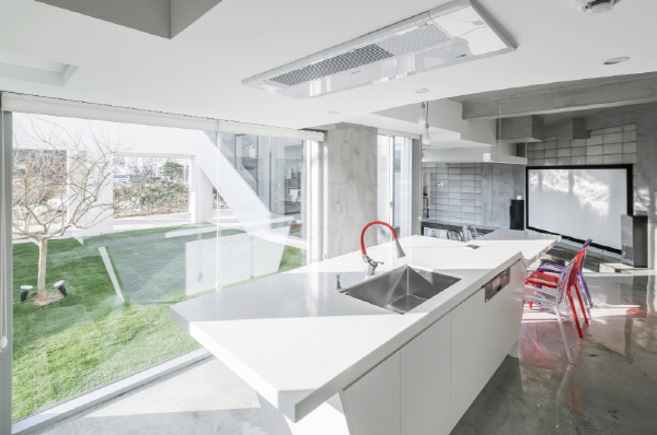 To satisfy the enjoyable life of outdoor living with garden which was a requirement of the owner, we introduced traditional factors of Korean architecture which are “Madang(innercourt)”, “Rumaru(floating pavilion in garden)”, “Jungja(pavilion on ground of garden)” and inclined roof garden as a small hill.