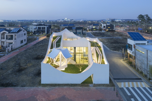 우리는 한국전통건축의 공간적, 조형적 요소들인 마당, 루마루, 정자 등을 현대성 있는 실용적 주거프로그램으로 변환하여 이 주택의 주요 외부공간 구성요소로서 적극 도입하고 모든 지붕 표면을 녹지화하여 안마당에서 옥상 최고지점까지 걸어서, 즉 산책적 순환이 가능한 경사식 옥상정원으로 전면 조경화함으로써, 이 집을 건축과 작은자연이 공존하는 조경적 동산으로 조성했다.