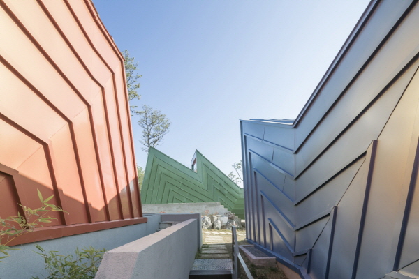 남향의 태양빛을 최대한 실내로 인입하기 위하여, 주변풍경을 적극적으로 끌어들여 실내에서의 회화적인 풍경의 연출을 꾀하기 위해, 그리고, 각 실내의 원활한 자연통풍을 위해서, 다양한 각도의 경사지붕들과 고창들이 각세대마다 방향을 달리하여 배치되었으며, 인접세대로부터의 시선을 상호차단하기 위한 경사날개벽의 부가, 또한 가파른 경사지형을 따라 흘러가는 스킵후로어 형식으로 배치된 지그재그식 동선이 만들어내는 역동적인 내외부 공간구조들은, 결과적으로 별을 닮은 건축적 “별”을 만들었다.