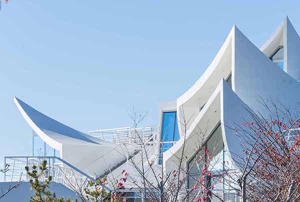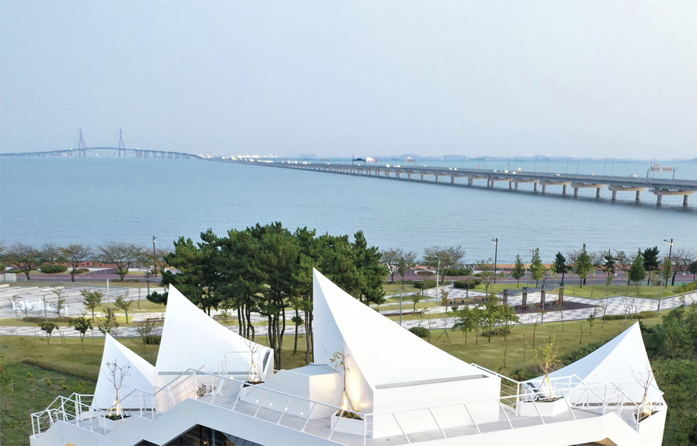 한국전통건축의 지붕곡선인 마이너스 곡선을 바람의 힘을 품고있는 역동적 돛과 동일시하여 전통건축의 조형성과 바닷가의 장소성을 동시에 표현하고자 했다.