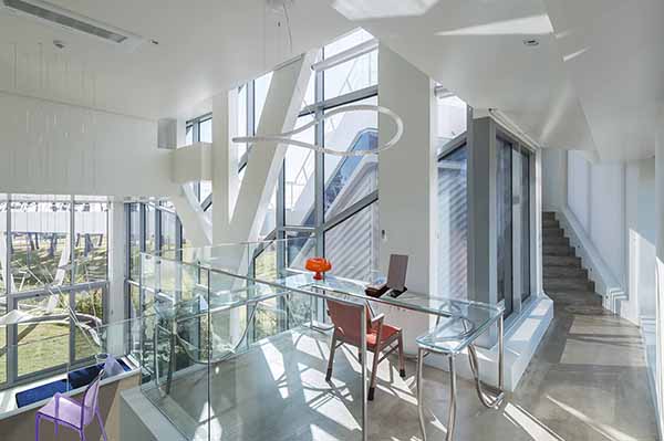 각 층의 여러 레벨에 위치한 개인침실마다 바다를 즐기는 옥외테라스가 부속되어있고 이들은 공중산책로로 상호연결되어 있으며 이 공중산책로는 안마당을 둘러싸인 내향적 공간으로 구성하는 공간 요소로서, 바다를 보는 전망대이다.